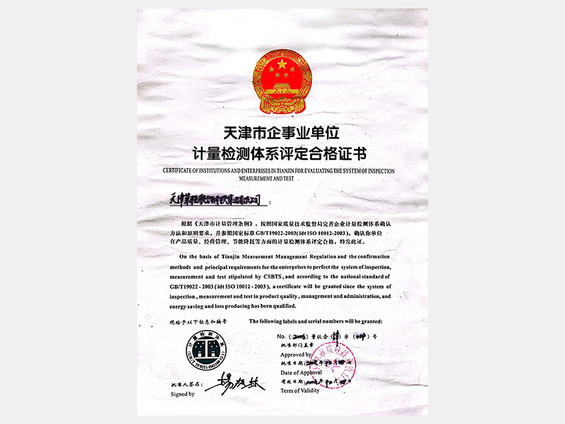 天津市企事業單位計量檢測體系評定合格證書