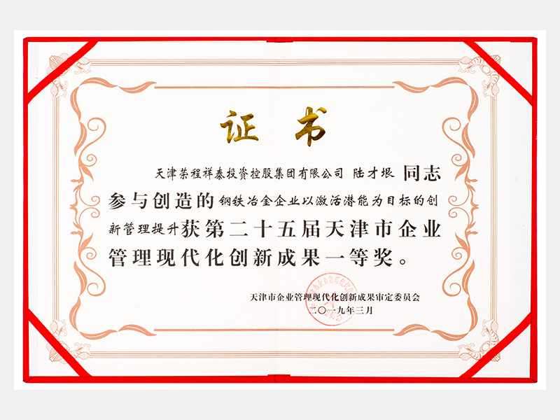 陸才垠同志參與創造的鋼鐵冶金企業以激活潛能為目標的創新管理提升獲第二十五屆天津市企業管理現代化創新成果一等獎。
