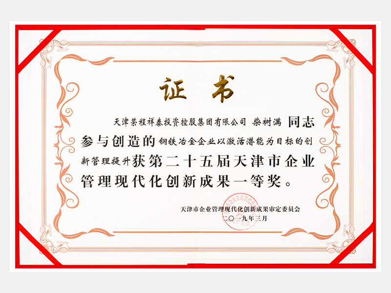 柴樹滿同志參與創造的鋼鐵冶金企業以激活潛能為目標的創新管理提升獲第二十五屆天津市企業管理現代化創新成果一等獎。