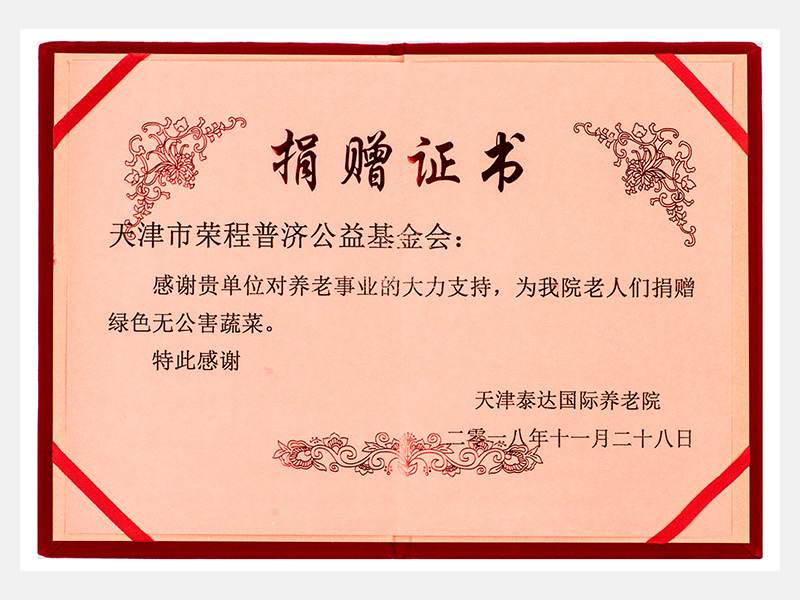 天津泰達國際養老院感謝捐贈證書(慈善)