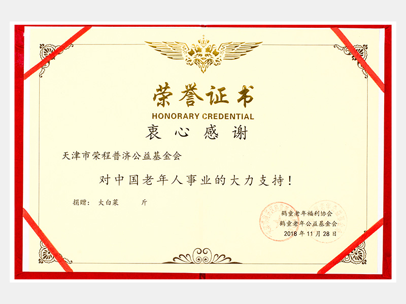 “購滯銷蔬菜捐贈養老院福利院活動”鶴童老年福利協會榮譽證書(慈善)