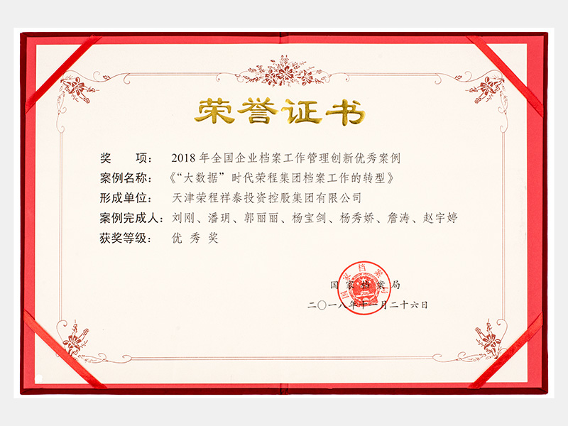 2018年全國企業檔案工作管理創新優秀案例優秀獎